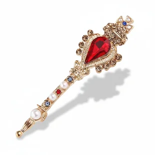 Broszka berło królewskie z perłami i kryształkami złota 6,5 cm Broszka berło królewskie z perłami i kryształkami złota 6,5 cm Efektowna broszka w kształcie królewskiego berła, inspirowana biżuterią pałacową i stylem vintage. Wykonana w złotym kolorze, bogato zdobiona czerwonym kamieniem, lśniącymi kryształkami oraz subtelnymi perłami, które nadają jej wyjątkowego, luksusowego charakteru. Smukła forma sprawia, że broszka prezentuje się niezwykle elegancko i przyciąga wzrok. Idealna jako ozdoba do marynarki, płaszcza, sukienki lub eleganckiego szala – doskonała na wyjątkowe okazje. Charakterystyka: