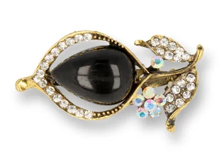 Charakterystyka produktu: Broszka czarny kwiat z listkami. Materiał: metal nieszlachetny, cyrkonie, kamienie kryształki Wysokość: ok. 2,5 cm Szerokość: ok. 6...