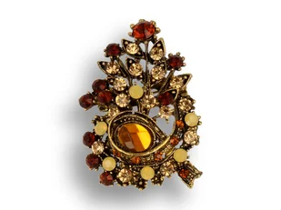 Charakterystyka produktu: Broszka koloru ciemnego złota z kolorowymi kryształkami Materiał: metal nieszlachetny, kamienie kryształki Wysokość: ok. 5 cm Szero...