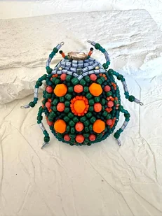 Ręcznie wyhaftowana broszka w kształcie chrząszcza, stworzona z koralików w odcieniach zieleni, pomarańczu i niebieskiego. Centralny element zdobi połyskujący kamień, który nadaje biżuterii elegancji i charakt ...