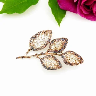Niezwykła broszka w kształcie gałązki z czterema listkami. Wykonana ze srebra, następnie pokryta oksydą w taki sposób aby nadać listkom piękny złoto-brązowy kolor, typowy dla jesiennej aury. Długość broszki 6,7 cm, szerokość 4,2 cm. Oryginalna i niezwykle efektowna. Waga: 10,5 gr.