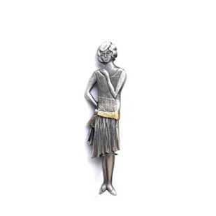 Urocza broszka srebrna w kształcie kobiety w stylu retro. Długość broszki 4,9 cm. Waga: 5 gr. Broszka pokryta oksydą i wypolerowana, szarfa pokryta złotem. E...