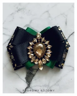 Broszka wykonana z wysokiej jakości taśm i dodatków. Brosza w kolorze czerni, zieleni i złota. Na środku olbrzymia ozdoba biżuteryjna w niespotykanym szampańskim kolorze. Brosza stworzona z myślą o kobietac ...