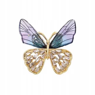 broszka w kształcie motyla, w kolorze jasnoniebieskim i złotym, zdobiona cyrkoniami w kolorze srebrzystym, elementy mocujące utrzymane w kolorze złotym, - zapięcie typu agrafka: broszka posiada zapięcie typu agrafka, które w prosty sposób można przypiąć do każdego ubrania czy dodatku. Agrafka trzyma na miejscu ozdobę przez cały czas, dzięki czemu nie trzeba się obawiać przypadkowego odczepienia i zgubienia biżuterii, - przeznaczenie: broszkę jako ozdobę i elegancki dodatek można przypiąć do żakietu, płaszcza, sukienki, koszuli, a nawet apaszki.