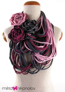 Oryginalny, designerski naszyjnik - szal, wykonany z pasów dzianiny w kolorze grafitowym, bordowym i pudrowego różu. Można go nosić jak szalik lub używać jako element stylizacji. W komplecie z 3 ręczni ...