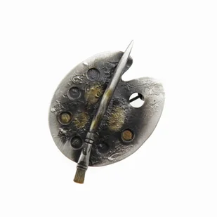 Niezwykła broszka ręcznie wykonana ze srebra w kształcie palety do malowania z pędzlem. Wymiary 3,3 cm na 2,6 cm. Waga:6,3 gr. Całość wykończona oksydą grafi...