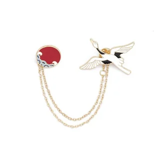 Cechy produktu Przypinka do odzieży Z krótkim łańcuszkiem Z motywem lecącego ptaka Kolor złoty Materiał: stal