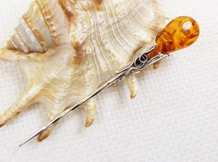 Szpilka srebrna z bursztynem naturalnym bałtyckim Jest wykonana ręcznie, z surowców najwyższej jakości. Szpilka jest bez zapięcia, może służyć do wpięcia we włosy, sweter, szal, krawat. . . Srebro próba 0,925. Waga całości: 6,9 gram. długość: 9,5 cm, wymiary bursztynu: