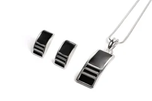 Komplet Nowoczesne Prostokąty kolczyki + wisiorek Elegancki błyszczący komplet biżuterii z pięknym głęboko czarnym wypełnieniem. Wykonany z wysokiej jakości ...