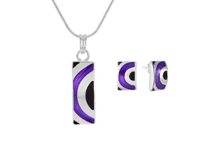 Komplet Kolorowe Łuki nowoczesny styl Komplet biżuterii w postaci prostokątów. Metal w kolorze srebrnym, czarna i fioletowa masa jubilerska. Łańcuszek oraz b...