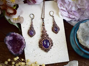 Elegancki zestaw biżuterii z ametystem, stworzony metodą elektroformowania z miedzi. Kolczyki i wisiorek inspirowane stylem gotyckim i wiktoriańskim, pełne drobnych detali. Idealny prezent dla niej, dos ...
