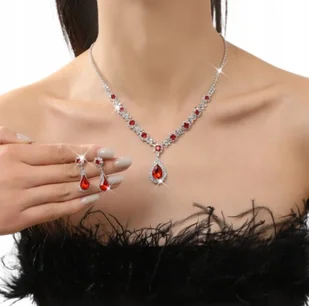 Zestaw Kolczyki Naszyjnik Ślub Srebrny Elegancki Rubinowy Cyrkonie B25