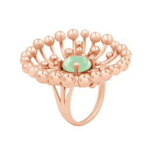 Pierścionek Celebrate z zielonym szkłem kryształowym różowe pozłocenie. Inspiracją do stworzenia limitowanej kolekcji Celebrate był bogaty w pozytywną symbolikę kwiat mniszka. Symbolizuje on szczęście i młodzieńczą radość, spełnienie życzeń oraz ciepło i moc słońca. Wielkość pierścionka: 4 cm Pierścionek został wykonany z mosiądzu pokrytego 18-karatowym różowym złotem.