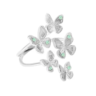 Pierścionek regulowany Papillon z szkłem kryształowym w kolorze pastelowej zieleni, posrebrzany. Autorska kolekcja Papillon to ukłon w stronę piękna motyli, ich delikatności oraz finezji. Uchwycone w ruchu, zatrzymane w najpiękniejszym momencie swojego życia są pochwałą natury, która wiosną budzi się do życia. Motyl jest symbolem przemiany, miłości oraz szczęścia. Pierścionek wykonany z mosiądzu pokrytego srebrem próby 925, zdobiony szkłem kryształowym w kolorze pastelowej zieleni.