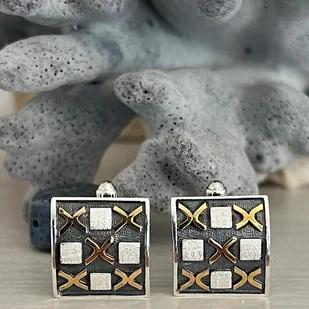 Ręcznie Robione Srebrne spinki do koszuki / Oksydowane Srebro + lite złoto 585 s137a Ekskluzywne Spinki do Mankietów ✨ Unikatowy Design i Precyzyjne Wykonanie (Wzór Szachownicy/Geometrii) Wyjątkowy spinki ...