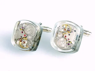 wykonane z pełnych mechanizmów starych zegarków ozdobione kamieniem zatopione w dwóch kroplach żywicy zabezpieczone aby stanowiły integralną całość i bezpiec...