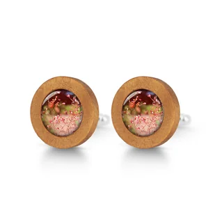 Kolekcja biżuterii - Romantic Garden. Grafika ukryta w drewnianej oprawie, pod osłoną przeźroczystego półokrągłego szkiełka. Średnica miniaturki grafiki 12 mm. Średnica oprawy ok. 18 mm. Grubość oprawy ok. 4 ...