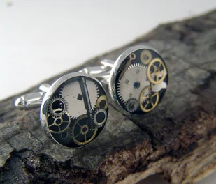 Eleganckie spinki do mankietów wykonane z metalu, żywicy oraz oryginalnych części zegarka. Industrialne detale zatopione w żywicy tworzą unikatowy, steampunkowy charakter, który podkreśli styl i osobowo ...