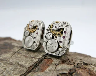 Eleganckie spinki do mankietów wykonane z oryginalnych mechanizmów zegarkowych w kolorze srebrnym. Idealny wybór dla osób szukających unikalnych, artystycznych dodatków. Wymiary mechanizmów: 1,7 x 1,4 cm ...