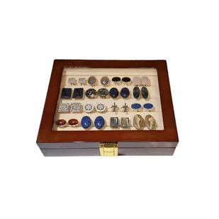 Ozdobne pudełko jubilerskie, drewniane na 16 par spinek (A012) - A012 Drewniane opakowania na spinki nadają im jeszcze większej elegancji. Spraw sobie prezent i dopełnij swoją kolekcję spinek do mankietów o drewniane opakowanie jubilerskie na 16 par spinek, pierścionków lub obrączek. Pudełko idealne jest również do przechowywania innych rodzajów biżuterii, prosimy jednak ostre krawędzie np. od kolczyków zabezpieczać barankami / zatyczkami silikonowymi lub wykonanymi z surowca tak jak biżuteria, w przeciwnym razie może dojść do uszkodzenia materiału.