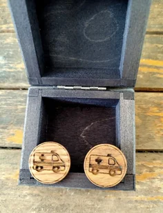Spinki do mankietów w kształcie koła Motyw laserowa na karetka. Materiał drewno naturalne. Średnica 2 cm. Ręcznie robione. Zapakowane w eleganckie drewniane pudeł ...