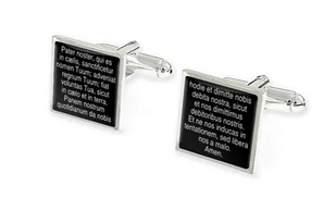 Spinki do Mankietów z modlitwią Ojcze Nasz Wykonane z błyszczącego metalu w kolorze srebra. Głęboko czarne tło i biały napis. Mocne zapięcie na obracaną przekładkę. ✔ Produkt jest dostępny ✔ Polska marka ✔ Fabryczne opakowanie Informacje Marka: Jubileo Kraj produkcji: