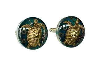 Cudowny pomysł na prezent dla Pasjonata gadów :-) - Średnica: ok 2 cm - Wnętrze w kolorze głęboko niebiesko-zielonym a na nim mieniący się żółw z złotych odcieniach, - Baza spinek - posrebrzana, w kolorze pla ...