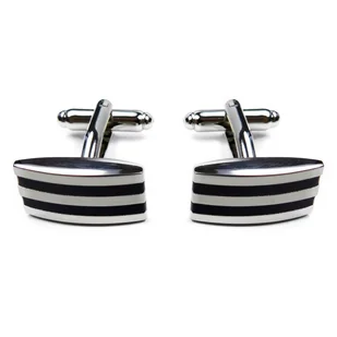 Srebrno-czarne połyskujące spinki do mankietów A21 Niezbędny dodatek do koszuli, spinki do mankietów w czarno-srebrne prążki. Eleganckie i stylowe, łączone sztywnym mostkiem, część ozdobna podłóżna, wykonana z dbałością o drobne detale. W harmonijnym zestawieniu z innymi dodatkami sprawią doskonałe wrażenie. Mogą okazać się również bardzo trafnym prezentem dla dbającego o wizerunek mężczyzny. W zestawie dwie spinki do mankietów zapakowane w eleganckie pudełko Cechy produktu: