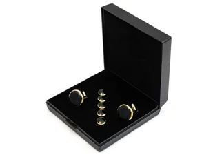 Złote spinki do mankietów i guziki do koszuli smokingowej - zestaw H17 Zestaw złotych spinek do mankietów i guzików do koszuli smokingowej to elegancki komplet dla mężczyzn, którzy chcą nadać swojej wieczorowej stylizacji perfekcyjny charakter. Czarny środek w złotej oprawie tworzy ponadczasowy, formalny kontrast. Zestaw idealnie zastępuje zwykłe guziki koszuli smokingowej, dodając jej prestiżu. To stylowy wybór na ślub, bal, galę oraz znakomity prezent. Spinki do mankietów koszuli – 2 sztuki; Guziki jubilerskie do koszuli smokingowej - 5 sztuk; Wykonane z wysokiej jakości stopu metalu.