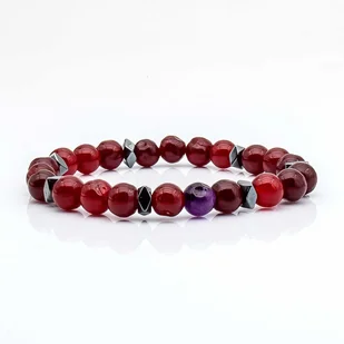 Bransoletki od EM Men's Accessories to produkowane w Polsce unikatowe dodatki, które będą będą doskonałym uzupełnieniem stroju każdego eleganckiego mężczyzny. Szeroka oferta naszych produktów pozwala na dobranie zarówno idealnej biżuterii dla siebie jak i znalezienie wspaniałegoupominku. Prezentowana bransoletka to piękne połączenie okrągłychelementówoczerwonym zabarwieniu orazmetalicznych i brązowych o innym kształcie. Całość posiada interesującą strukturę, która sprawia, że bransoletka prezentuje się szlachetnie. Materiał: rozciągliważyłka, koraliki, kamienie naturalne Dominujące kolory: