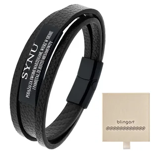 Bransoletka męska CZARNA skórzana z GRAWEREM blasz ✴️ Więź jaka łączy Cię z synem daje poczucie dumy i szczęścia, widząc, jak rośnie i staje się niezależnym, pełnym pasji człowiekiem. ✴️ Personalizowana biżuteria to sposób, by wyrazić, jak wiele znaczy dla Ciebie, będąc częścią Twojego świata i serca. ✴️ Niech podarowana biżuteria będzie symbolem wyjątkowej więzi i towarzyszy Twojemu Synowi na każdym etapie jego życia przypominając mu o tym co ważne. Długość całkowita: 21,5 cm Szerokość: