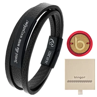 Bransoletka męska CZARNA skórzana z GRAWEREM stal Wyjątkowy, męski design - połączenie trzech pasków naturalnej skóry, w tym skóry węża, tworzy niepowtarzalny i stylowy wygląd. Personalizacja - możliwość wykonania indywidualnego graweru sprawia, że bransoletka staje się wyjątkowym i osobistym dodatkiem. Komfort i bezpieczeństwo - magnetyczne zapięcie zapewnia wygodę noszenia, a jednocześnie pewność, że bransoletka nie odepnie się samoistnie. Elegancki blask - anodowana, czarna blaszka, wypolerowana na wysoki połysk, dodaje bransoletce subtelnego, ale wyrafinowanego charakteru. Wszechstronność stylizacji - bransoletka idealnie pasuje zarówno do codziennych, jak i bardziej eleganckich outfitów, podkreślając indywidualny styl.