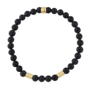 Bransoletka męska czarne matowe kulki onyksu i złote charmsy stal szlachetna.