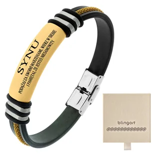 Bransoletka męska KAUCZUKOWA z grawerem łańcuszek Podaruj symbol trwałej miłości - Wybierz czarną bransoletkę z eleganckimi złotymi elementami, która wyrazi Twoją głęboką więź z synem. Spersonalizuj prezent wyjątkowym grawerem - Dodaj imię, ważną datę lub osobistą dedykację, tworząc pamiątkę na całe życie. Zapewnij komfort i trwałość noszenia - Wysokiej jakości kauczuk jest elastyczny i odporny, a złote elementy ze stali nierdzewnej zachowują swój blask. Podkreśl jego styl uniwersalną elegancją - Połączenie czerni i złota sprawia, że bransoletka pasuje do każdego stroju, dodając mu klasy. Stwórz niezapomniany upominek na każdą okazję - Ta spersonalizowana bransoletka to idealny prezent, który zostanie z nim na długo.