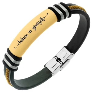 Wszystkie stalowe elementy bransoletki zostały wypolerowane na wysoki połysk. Kauczukowa męska bransoletka dostępna jest w dwóch wariantach kolorystycznych do wyboru: z blaszką i zapięciem w kolorze srebrnym oraz w kolorze złotym pozłoconym 24-karatowym złotem.