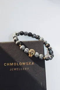 Bransoletka składa się z kamienia obsydian śnieżny oraz metalowych przekładek antyalergicznych. Obsydian śnieżny uważany jest za tzw. kamień trosk lub kamień zmartwień, ponieważ łagodzi niepokój, stres oraz ch ...