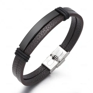 Bransoletka męska skórzana brązowa stal czarna 21cm Bransoletka męska skórzana brązowa stal czarna 21cm Bransoletka męska skórzana brązowa stal czarna 21cm Połączenie ciepłego brązu z czarnym metalowym akcentem nadaje bransoletce wyjątkowego charakteru. Ten model łączy elegancję i nowoczesny styl, sprawdzając się zarówno w codziennym, jak i bardziej formalnym stroju. Parametry: Długość: 21 cm Szerokość: 1 cm Materiał: skóra ekologiczna, stal nierdzewna 316L Kolor: