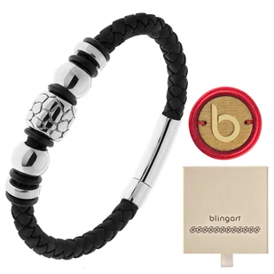 Bransoletka męska SKÓRZANA pleciona ZATRZASKOWA ST Nowoczesna elegancja – połączenie czarnej skóry i lśniącej stali tworzy niepowtarzalny look z klasą i charakterem. Dopracowane detale – efekt spękań, czarna farbka i symetryczny układ koralików dodają wyrazistości i unikalności każdemu ruchowi. Bezpieczne zapięcie – zatrzask działa pewnie i dyskretnie, dając Ci pełną swobodę i pewność, że bransoletka zostanie tam, gdzie powinna. Stylowa uniwersalność – pasuje zarówno do t-shirtu, jak i sportowej marynarki – zawsze podkreślając Twój gust i osobowość. Długość: 21,5 cm Szerokość: