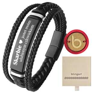 Bransoletka męska skórzana z grawerem czarna preze Twój osobisty grawer: Gładka, czarna blaszka to doskonałe miejsce na personalizowany grawer. Dodaj inicjały, ważną datę, motto lub symbol, aby bransoletka stała się unikatowym i sentymentalnym talizmanem, który opowiada Waszą historię. Mocny styl i ponadczasowy design: Połączenie trzech pasków – dwóch plecionych i jednego gładkiego – tworzy nowoczesny i męski duet.