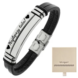 Bransoletka Męska Czarna ze Skóry Srebrna GRAWER Prezent Dla Chłopaka Męża