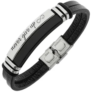 Bransoletka męska SKÓRZANA z grawerem srebrno czar Bransoletka męska SKÓRZANA z grawerem srebrno czarna stal PREZENT Bransoletka wykonana z najwyższej jakości stali chirurgicznej 316L oraz skóry naturalnej. Składa się z 2 klasycznych czarnych pasków oraz dwóch stalowych blaszek w kolorze srebrnym. Blaszka czarna jest anodowana, jest to specjalna technika barwienia metali, która gwarantuje trwałość koloru i odporność na zarysowania, natomiast blaszka stalowa jest w kolorze srebrnym. Po bokach blaszek znajdują się zabezpieczenia w postaci podwójnych stalowych separatorów oraz silikonowe gumki. Chronią one blaszki przed przesuwaniem się oraz zarysowaniami.
