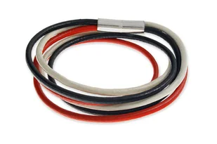 Bransoletka z magnesem skórzana Bransoletka wykonana z trzech rzemieni- biały, czarny, czerwony. Wykonana ze skórzanego laminatu. Zapięcie w postaci magnesów...