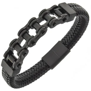 Bransoletka skórzana męska czarna MOTO CHAIN Bransoletka skórzana czarna o oryginalnym i nowoczesnym wzorze. Trzon bransoletki stanowi plecionka wykonana ze skóry naturalnej. W środkowej części znajduje się zdobienie wykonane z łańcucha motocyklowego. Elementy stalowe są w kolorze czarnym (są barwione metodą anodowania). Taki element świetnie uzupełni każdą stylizację! Bransoletka posiada zapięcie magnetyczne.
