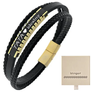 Bransoletka z GRAWEREM męska skóra + stal potrójna Serce zamknięte w grawerze – czarna anodowana blaszka to idealne miejsce na słowa, które Tata zapamięta na całe życie Wyjątkowy styl dla wyjątkowego Taty– połączenie plecionych pasków i stali pozłacanej 24-karatowym złotem podkreśla klasę, charakter i męską siłę Codzienna przypominajka o Tobie – prezent, który Tata może nosić zawsze przy sobie – jak dowód więzi, dumy i miłości Trwałość jak relacja Ojca z Dzieckiem – naturalna skóra, stal chirurgiczna i perfekcyjne wykończenie to gwarancja jakości, która nie przemija Długość: 21 cm Szerokość: 1,5 cm Waga: 21 g Wymiary blaszki: 4,2 cm x 0,7 cm Skomponuj własny grawer Na biżuterii umieścimy Twój indywidualny grawer, który sprawi, że będzie ona wyjątkowa i niepowtarzalna! Ważne: