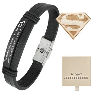 Bransoletka z grawerem skórzana męska czarna Długość: 20 cm Szerokość 1 cm Grubość: 3 mm Wymiary blaszki: 3,9 cm x 0,7 cm Waga: 11 g Skomponuj własny grawer Na biżuterii umieścimy Twój indywidualny grawer, który sprawi, że będzie ona wyjątkowa i niepowtarzalna! Ważne: