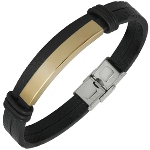 Bransoletka z grawerem skórzana męska pozłacana Skórzana bransoletka wykonana z połączenia dwóch umieszczonych równolegle pasków ze skóry naturalnej oraz najwyższej jakości stali chirurgicznej 316L. Elementy stalowe wypolerowane na wysoki połysk oraz pozłacane 14k złotem. Specjalna technologia barwienia gwarantuje trwałość koloru. Precyzyjne wykonanie z najlepszych materiałów. Możliwość samodzielnego skrócenia poprzez docięcie paska na odpowiednią długość.