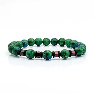Bransoletki od EM Men's Accessories to produkowane w Polsce unikatowe dodatki, które będą będą doskonałym uzupełnieniem stroju każdego eleganckiego mężczyzny. Szeroka oferta naszych produktów pozwala na dobranie zarówno idealnej biżuterii dla siebie jak i znalezienie wspaniałegoupominku. Prezentowana bransoletka to piękne połączenie okrągłychelementówoczerwonym zabarwieniu orazmetalicznych i brązowych o innym kształcie. Całość posiada interesującą strukturę, która sprawia, że bransoletka prezentuje się szlachetnie. Materiał: rozciągliważyłka, koraliki, kamienie naturalne Dominujące kolory: