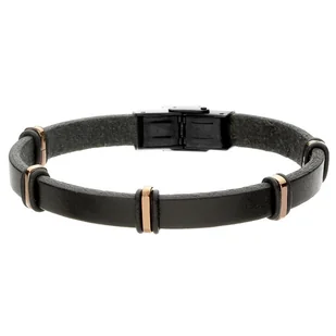 Bransoletka męska wykonana z czarnej naturalnej skóry i antyalergicznej stali szlachetnej 316L, zdobiona stalowymi ozdobami w stylu minimalistycznym. Kolor: czarny Materiał: stal szlachetna, skóra naturalna Obwód wewnętrzny: ~20 cm Wymiary: szerokość: 8mm Powłoka: