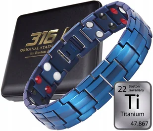 GRUBA TYTANOWA ZDROWOTNA BRANSOLETA MĘSKA MAGNETYCZNA MOCNA CZYSTY TYTAN BOSTON JEWELLERY® Przedstawiamy wysokiej jakości kolekcję biżuterii marki BOSTON JEWELLERY® ze stali chirurgicznej, tytanu oraz wolframu. Obecnie wyroby z tych szlachetnych metali są hitem na rynku !!! W tej ofercie prezentujemy wyjątkowo elegancki model męski bransolety magnetycznej, który wykonany jest z NAJWYŻSZEJ JAKOŚCI CZYSTEGO TYTANU PURE TITANIUM anodowanego na przepiękny kolor - NIEBIESKI KSIĘŻYCOWY. Model ten wyróżnia bardzo eleganckie połączenie elementów matowych i z połyskiem. Taki układ bardzo efektownie się prezentuje na dłoni i robi niesamowite wrażenie !!! Jest to jeden z najciekawszych i najlepiej sprzedających się modeli w ostatnim czasie ! ✅ORYGINALNA BRANSOLETA BOSTON JEWELLERY® Z OFICJALNEJ DYSTRYBUCJI - AUTENTYCZNY, CZYSTY TYTAN. PRODUKT KLASY PREMIUM ! W bransolecie zastosowano wyjątkowe połączenie 4 technologii - oprócz magnesów neodymowych , które mają bardzo korzystny wpływ na organizm człowieka, umieszczono tutaj wstawki bioceramiczne FIR, NEGATIVE ION oraz GERMANIUM.