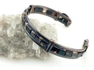 Męska bransoleta miedziana z czarnym agatem dla ekologa, tancerza, stomatologa, rękodzieło. Obwód bransolety 19 cm, regulowany. Szerokość bransolety 1. 2 cm. Odstęp między paskami 3 cm. Waga bransolety 17 gram.